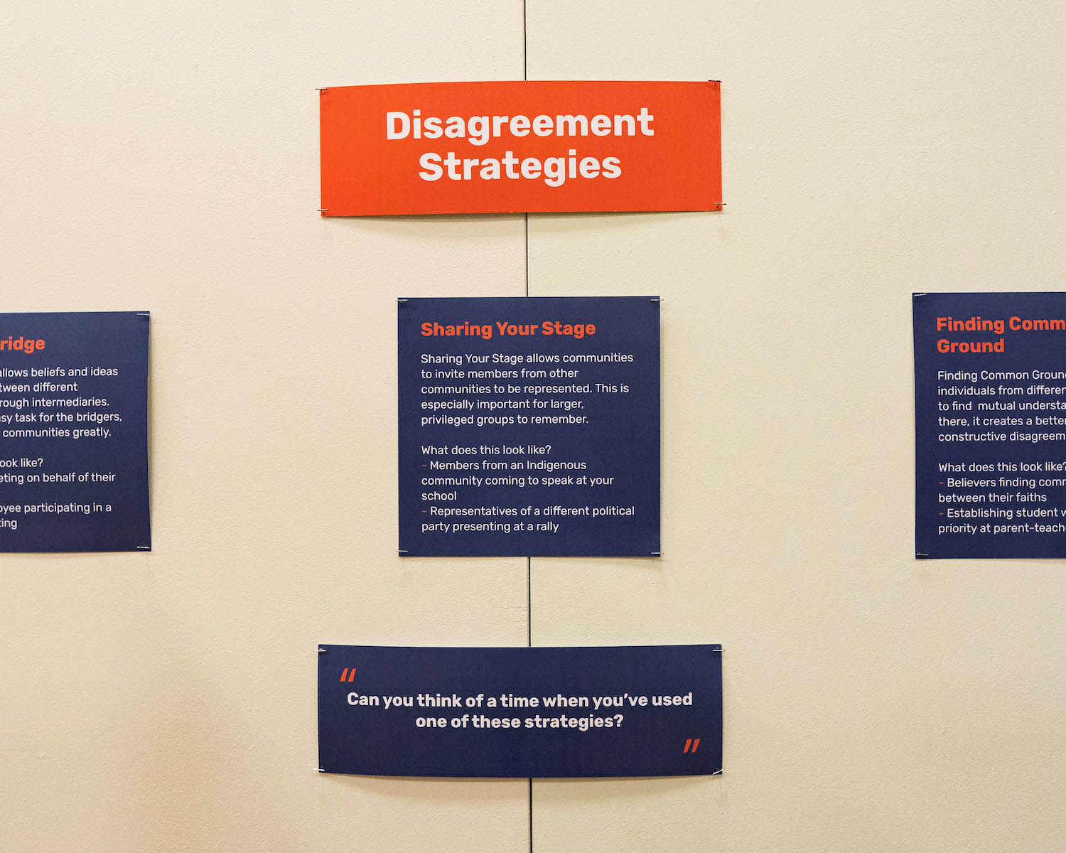 We began by researching the causes for social instability in Canada. Through academic papers and engaging with citizens we understood that a high degree of political polarization strained critical relationships in our social fabric. We learned how echo chambers and refusing to engage with the “other side” only heightened these fractures. We found disagreement to be fundamental to all sustainable communities. The importance of engaging in constructive disagreements has been exemplified everywhere from geopolitical disputes to interpersonal relationships.